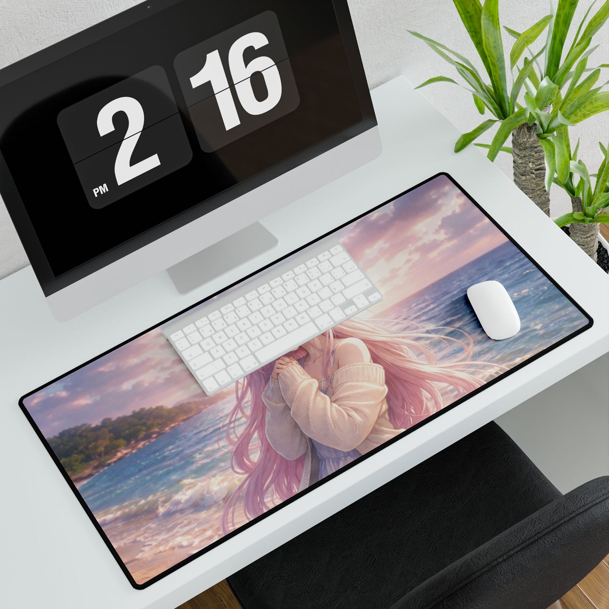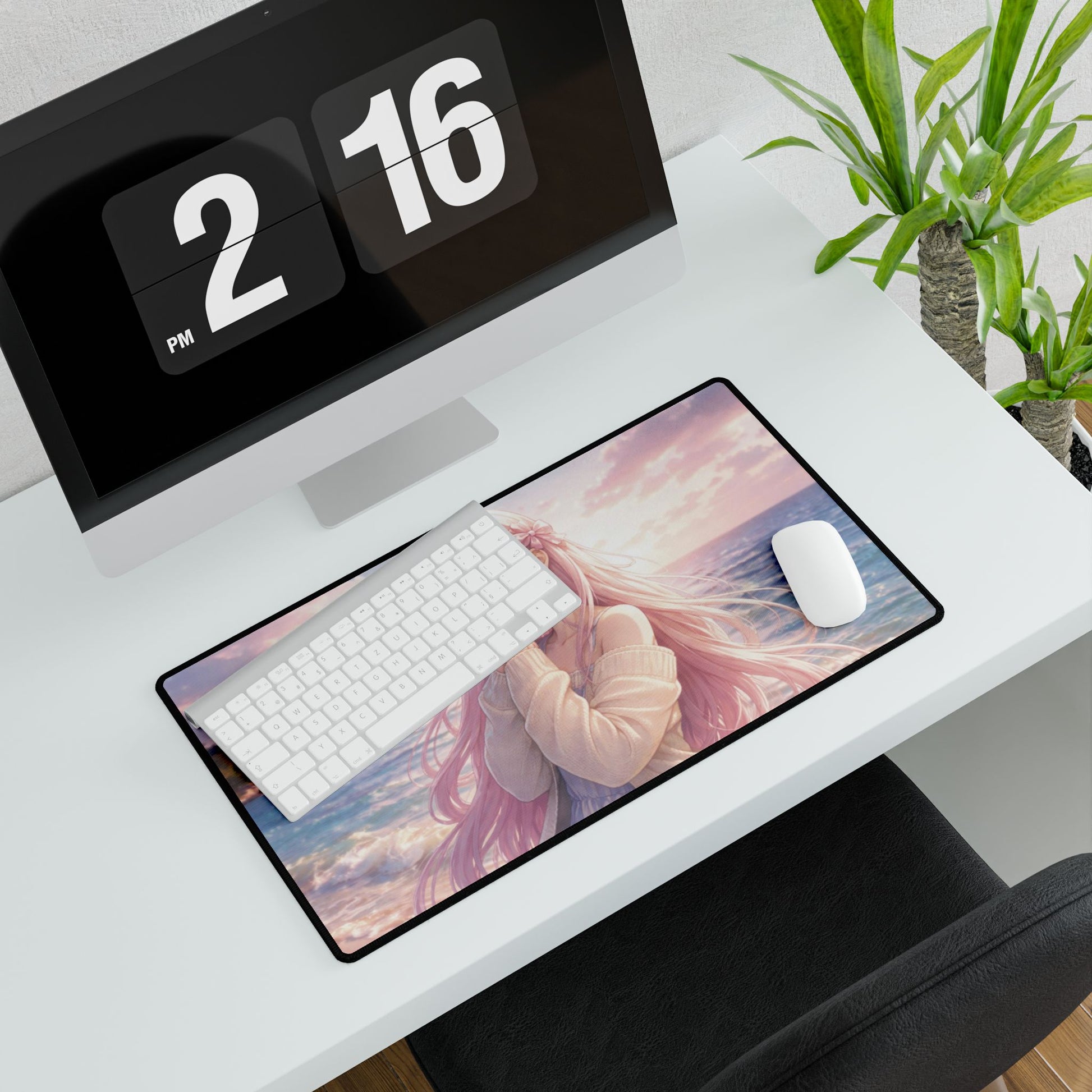 Wrap your workspace in a soft, seaside daydream. This large desk mat features a pastel anime-style girl on a sunlit shore — gentle pinks, warm golds, and a breezy horizon blend into a calm, inviting surface. It tames clutter, cushions your wrists, and turns repetitive clicks into a small moment of comfort. Easy to wipe clean and built to handle regular use, the smooth top keeps your mouse gliding precisely while the grippy rubber base locks the mat in place. Leave your desk feeling calmer and more personal every time you sit down to work, sketch, or game.