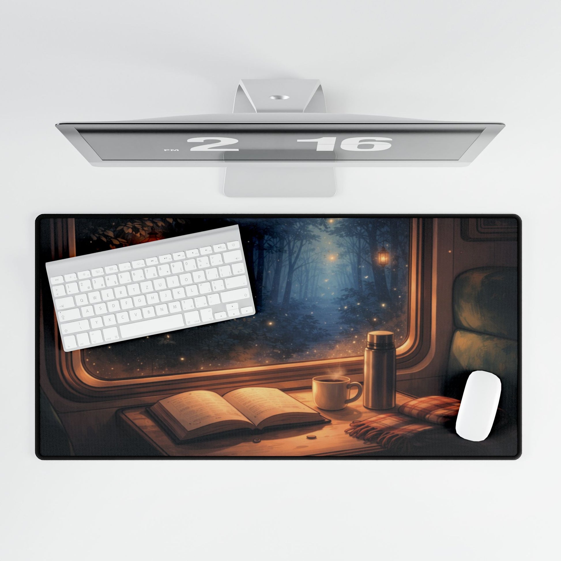 Cozy Night Train Desk Mat — Reading, Coffee & Window Scenery Mouse Pad