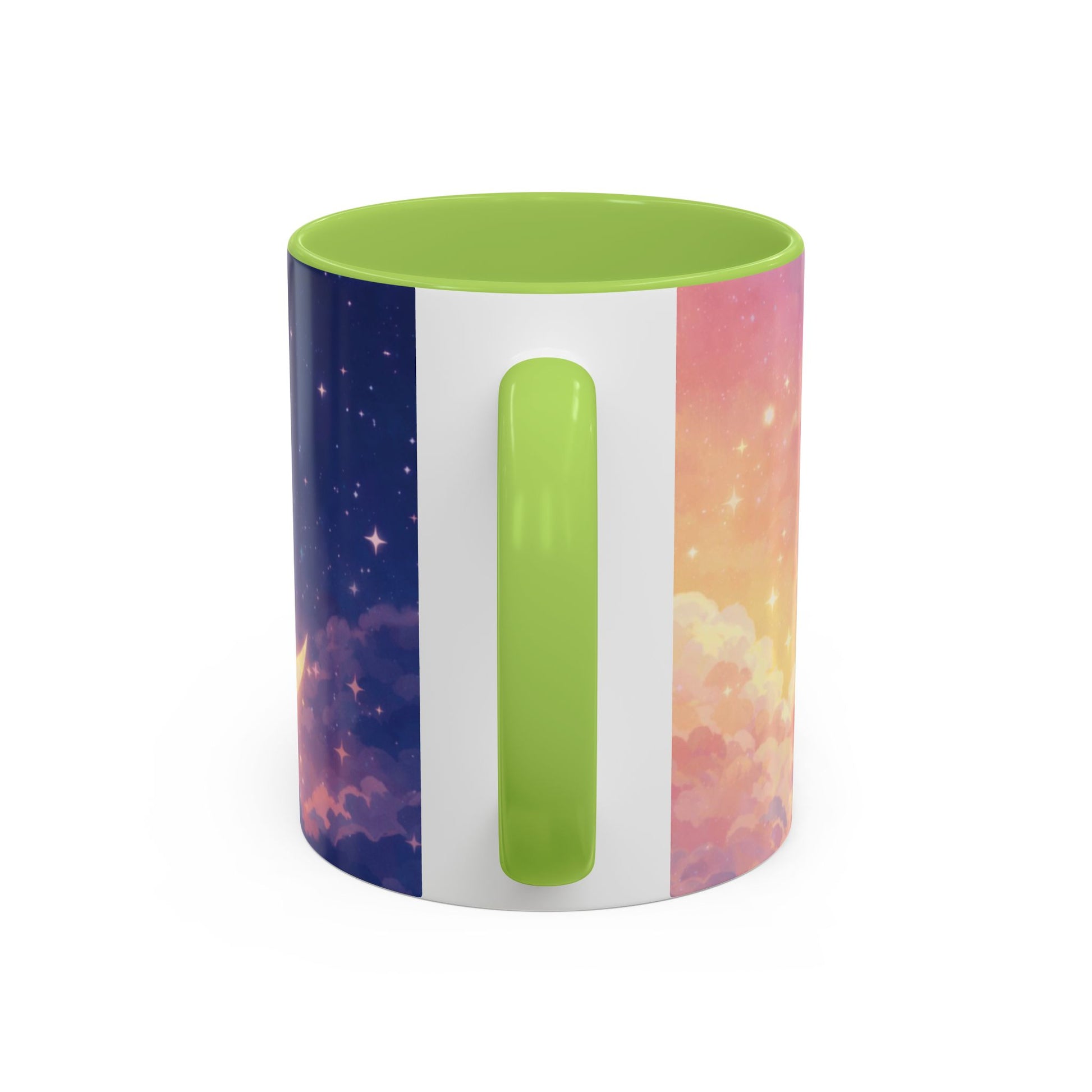 Slow, quiet mornings wrapped in violet light. This ceramic mug carries a dreamy night-sky illustration—soft clouds, scattered stars, and a gentle crescent moon—so your coffee or tea feels like a small, private ritual. The colored interior and handle add an extra note of contrast that makes the scene pop while the glossy finish highlights the artwork’s painterly texture. Hold it between both hands and breathe in a moment of calm before the day begins, or tuck it into an evening routine where stories and reflection gather like constellations.