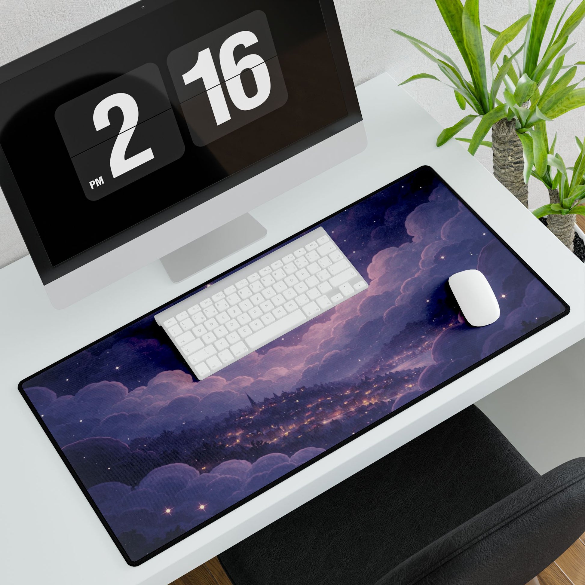 Spread across your desk like a midnight window, this desk mat brings a quiet, dreamy skyline to your workspace. A soft crescent moon hangs over pillowed clouds and a sleepy town, bathed in violet and indigo tones that calm the mind and sharpen focus. The large, smooth surface gives your mouse effortless glide while the textured natural rubber base keeps everything anchored during late-night sessions. It’s the kind of desk piece that turns everyday tasks into small moments of calm—perfect for sketching ideas, writing notes, or settling into a gentle work flow as the world outside winds down.